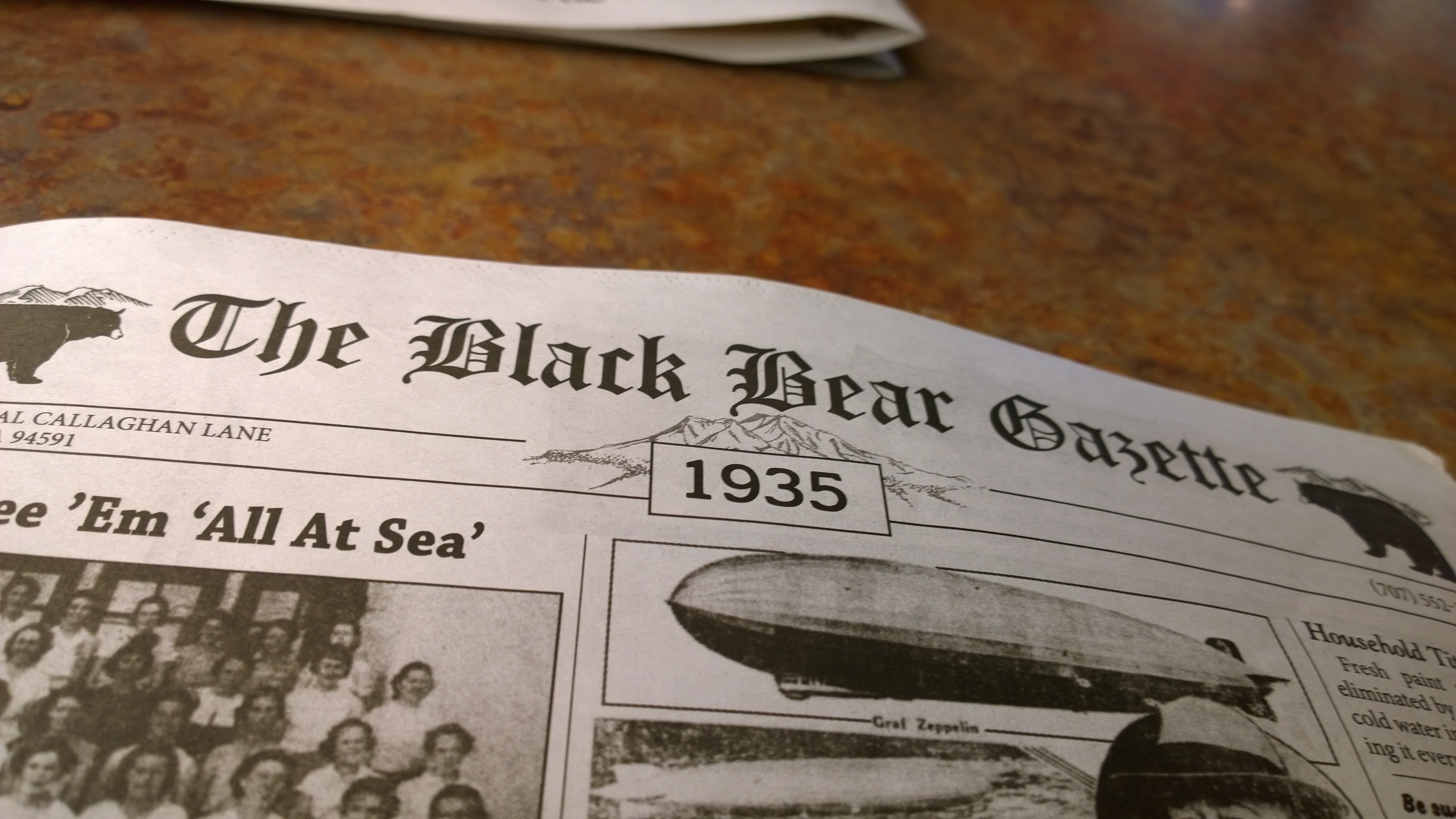 The first time I ever ate at a Black Bear Diner was in Suisun and to me it seemed like a super suburban type of place – almost country – that served good food and had good service. There’s a lot of wood used in the decor. Of course a Black Bear statue or several of them stand guard inside and out of the restaurant. The one in Vallejo even has a log toy train with little bears on them and my kids didn’t hesitate climbing atop and pretending to ride it and acted like they were friends with these cub statues. Adding to the ambiance, the menu looks like a old time newspaper from small town. You get the idea. It’s like you’re out in the country where black bears may join you for dinner.
